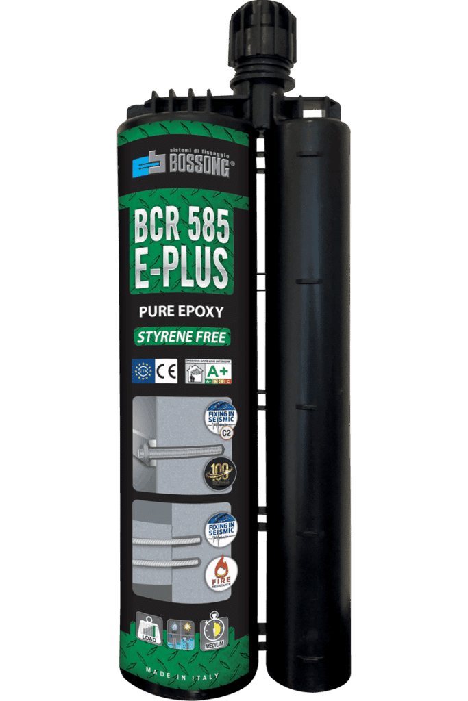 Ancorante chimico epossidico, nel formato 585 ml, certificato per il fissaggio e per le riprese di getto post-installate con qualifica sismica. Adatto a carichi elevati e utilizzabile in presenza di foro allagato e fori carotati.